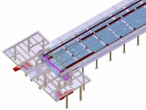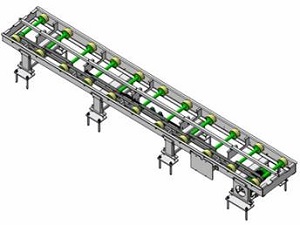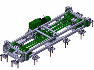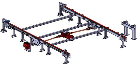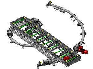 該系統(tǒng)包含的主要輸送機形式有:滾床、轉(zhuǎn)臺、橫移機、橫移鏈、升降機、鏈床、板鏈等等,由于托盤載荷較大,對設備的承載能力有較高的要求。鏈床主要應用于合裝線及相關(guān)托盤儲存線,它運行平穩(wěn)、噪音低、可實現(xiàn)高速運行,尤其適用于自動化程度和精度要求高的合裝線。